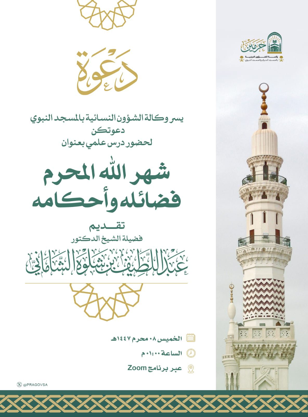 نفذت وكالة الشؤون النسائية في المسجد النبوي درساً علمياً بعنوان (شهر الله المحرم: فضائله وأحكامه)، قدمه فضيلة الشيخ الدكتور عبداللطيف الشاماني، مساء يوم الخميس، عبر برنامج الزووم عن بُعد.