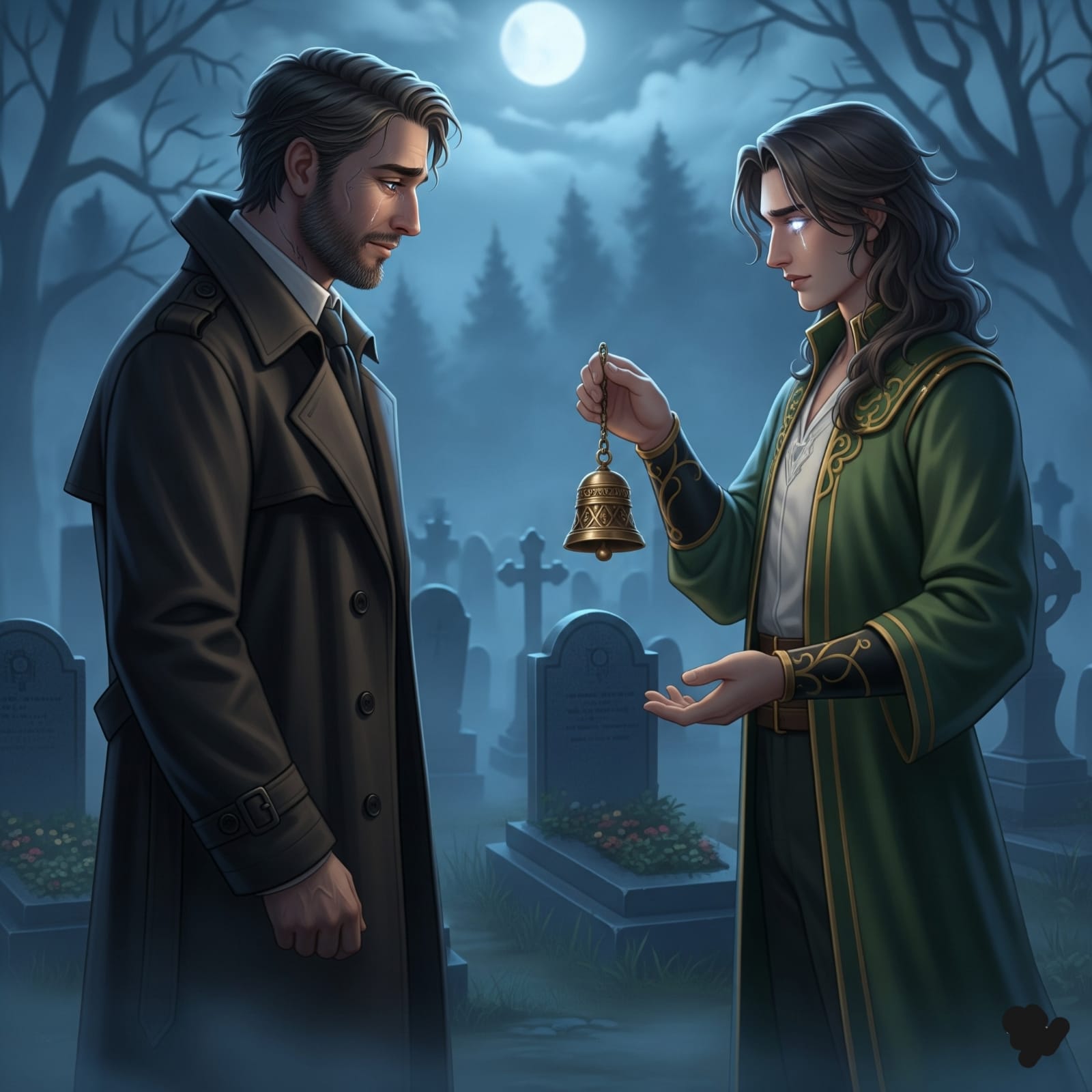 وحينَ انتصفَ الليلُ، هبّتْ نسمةٌ باردةٌ أيقظتْ في جسدِهِ قشعريرةً، ثمَّ سمعَ رنينَ جرسٍ قادماً منْ بعيدٍ. اقتربَ منَ النافذةِ، فلمْ يرَ شيئاً. خرجَ يتتبعُ الصوتَ، فوجدَ شاباً وسيماً، أبيضَ البشرةِ، طويلَ الشعرِ، يرتدي ثياباً خضراءَ، وفي يدِهِ جرسٌ صغيرٌ يحرّكُهُ برفقٍ. كانَ الشابُّ يمشي بهدوءٍ بينَ القبورِ، وكأنَّهُ يسيرُ في طريقٍ يعرفُهُ جيداً.