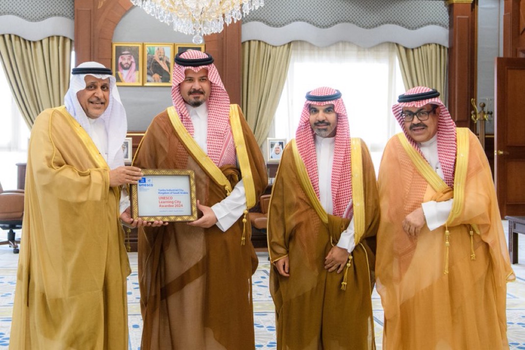 أمير المدينة يتسلم التذكار الرسمي لفوز ينبع الصناعية بجائزة اليونسكو لمدن التعلّم 2024