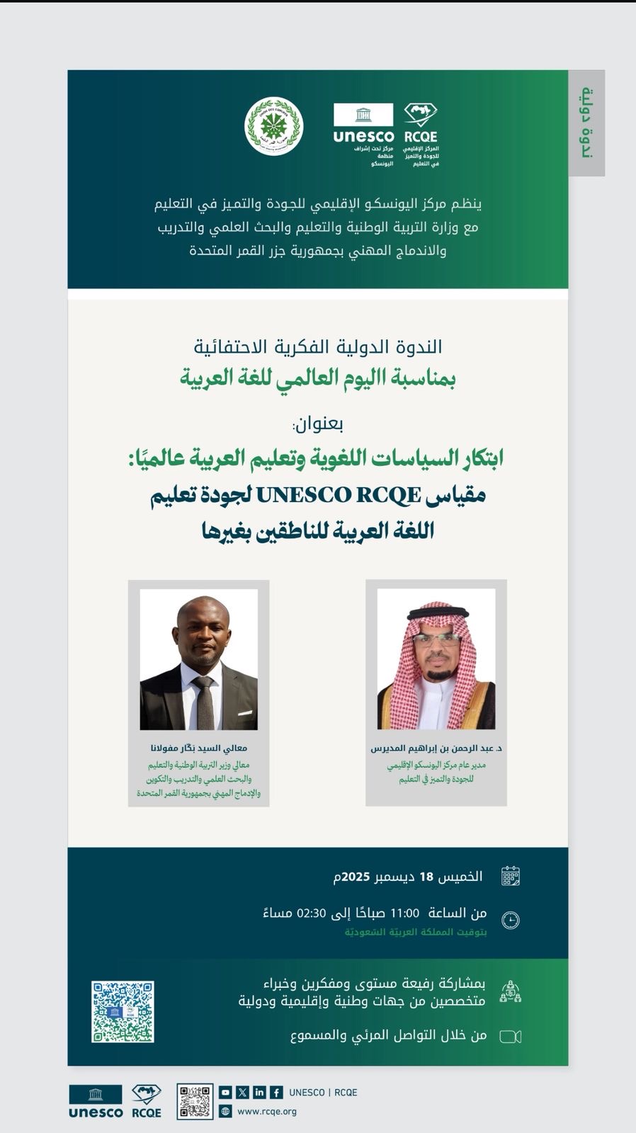 ويدعو مركز اليونسكو الإقليمي للجودة والتميز في التعليم الباحثين والمهتمين والمؤسسات التعليمية إلى المشاركة في هذا الحدث النوعي، الذي يسهم في صياغة مسارات مستقبلية أكثر شمولًا وابتكارًا للغة العربية.
