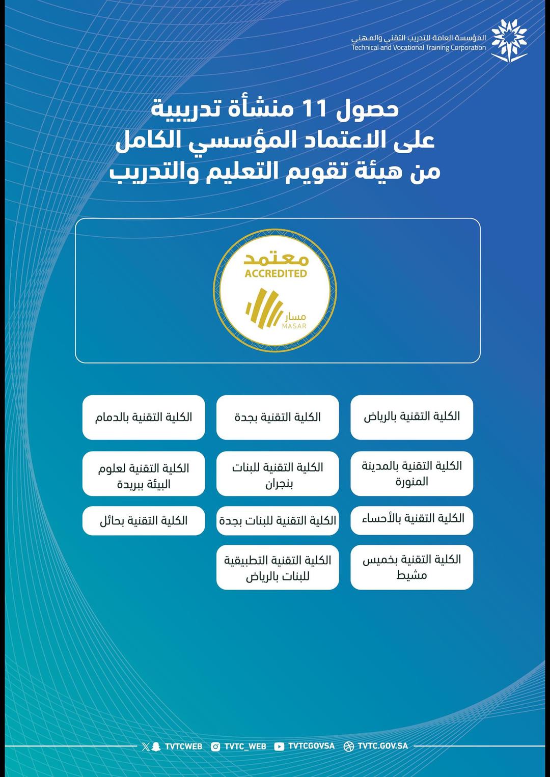 وشملت قائمة المنشآت الحاصلة على الاعتماد المؤسسي الكامل: الكليات التقنية بالرياض، وجدة، والدمام، والمدينة المنورة، وحائل، والأحساء، وخميس مشيط، إضافةً إلى الكليات التقنية للبنات في جدة ونجران، والكلية التقنية التطبيقية للبنات بالرياض، والكلية التقنية لعلوم البيئة ببريدة.