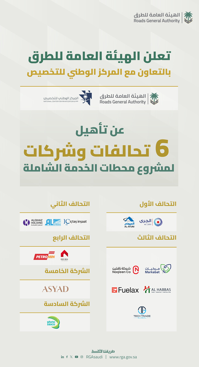 أعلنت الهيئة العامة للطرق، بالتعاون مع المركز الوطني للتخصيص، عن أسماء التحالفات والشركات التي تأهلت للمنافسة على مشروع محطات الخدمة الشاملة في مختلف مناطق المملكة العربية السعودية.