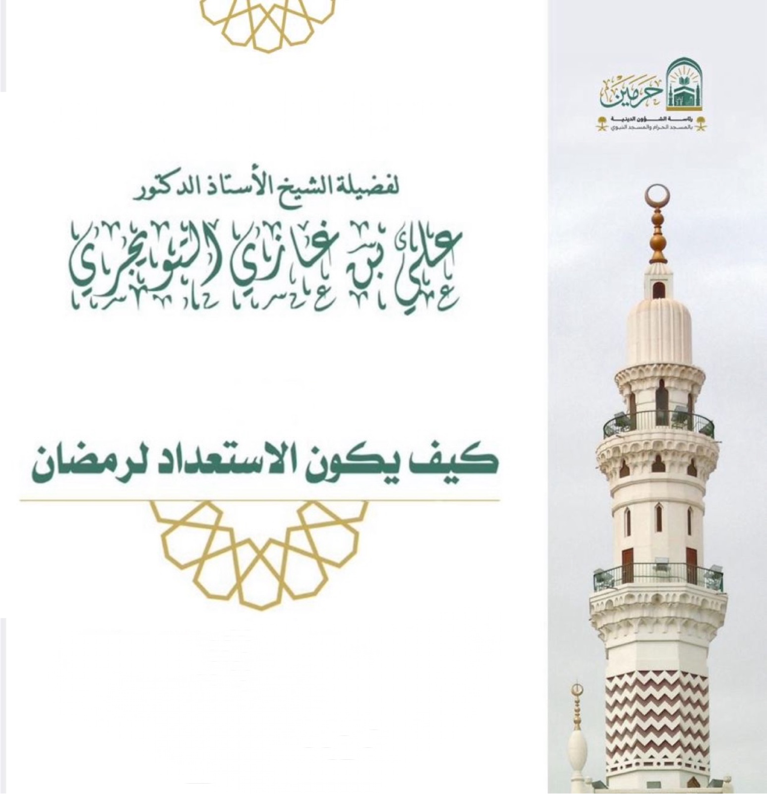 واصلت وكالة الشؤون النسائية في المسجد النبوي تنفيذ خطتها التشغيلية، من خلال تفعيل وتنظيم المحاضرات العلمية الموجهة لقاصدات المسجد، حيث أُقيمت محاضرة بعنوان «كيف يكون الاستعداد لرمضان» قدّمها فضيلة الشيخ الأستاذ الدكتور علي بن غازي التويجري، المدرّس بالمسجد النبوي، وذلك ضمن برنامج «أتاكم خير الشهور».