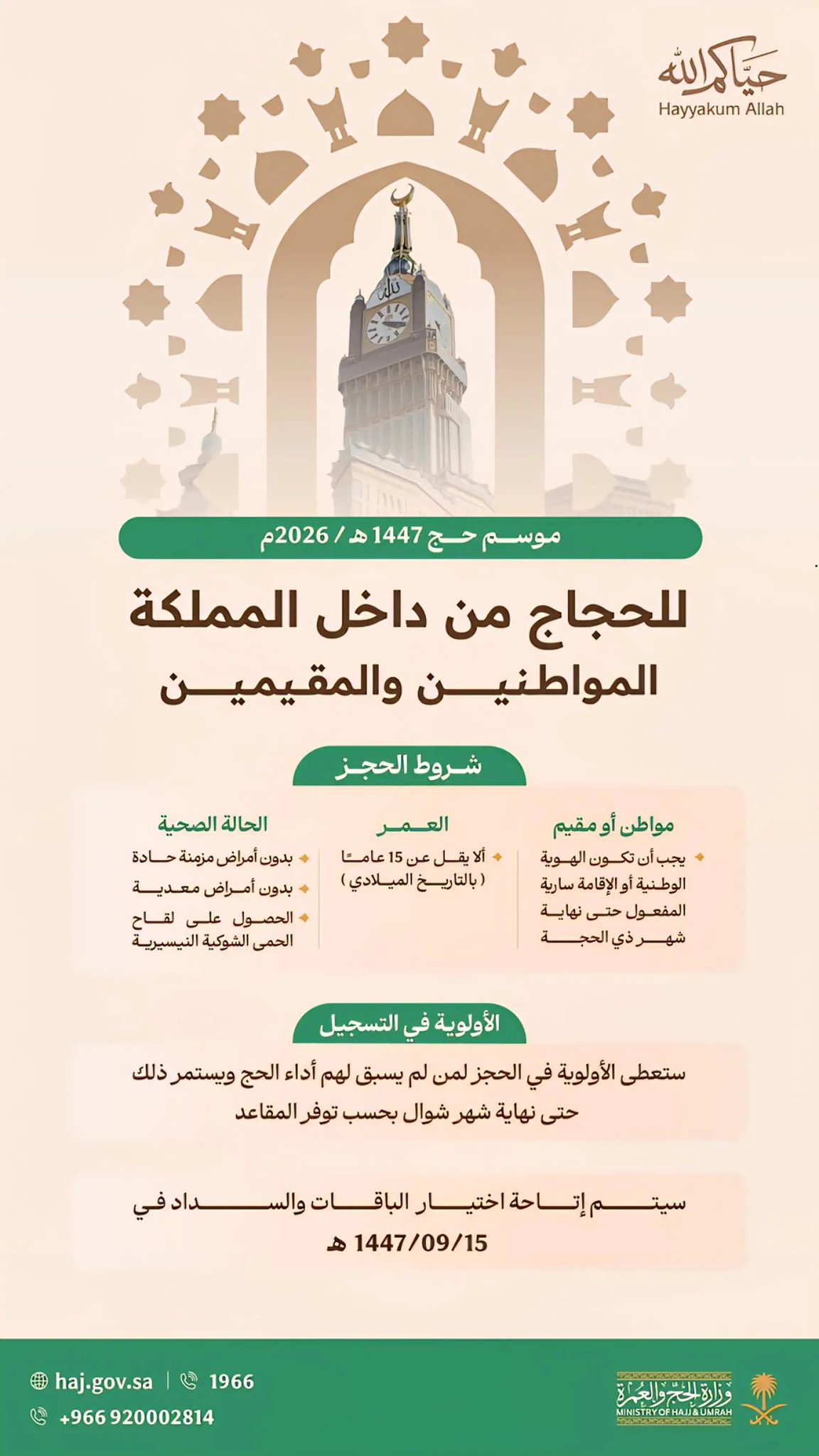 أعلنت وزارة الحج والعمرة فتح التسجيل للراغبين في الحج من داخل المملكة (المواطنين والمقيمين ممن لديهم إقامة سارية)، عبر تطبيق نسك والموقع الإلكتروني https://www.nusuk.sa/ ابتداءً من 6 رمضان 1447هـ، على أن يبدأ حجز الباقات في 15 رمضان.
